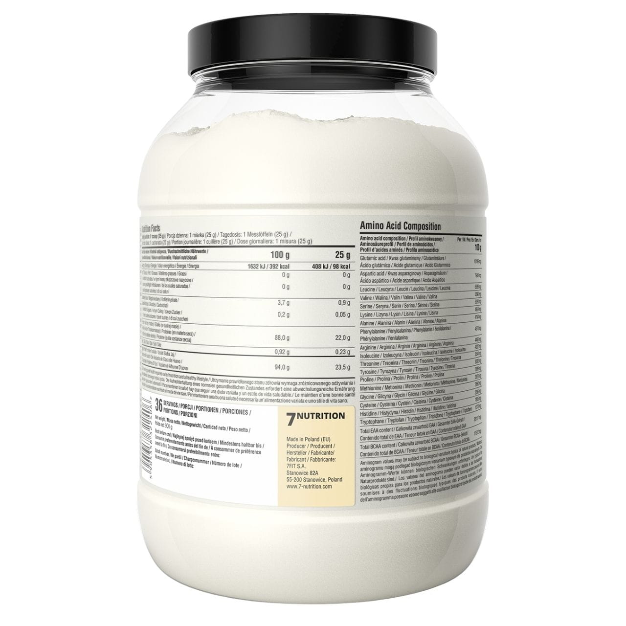7Nutrition EGG Protein, met vanillesmaak is een voedingssupplement in poedervorm dat 94% ei-eiwitisolaat bevat. Elke portie (25 g) levert ca. 23,5 g eiwit, inclusief alle essentiële aminozuren. De verpakking van 900 g bevat ca. 36 porties. Eiwit draagt bij aan spiergroei en helpt bij het behoud van spiermassa. Lactosevrij, glutenvrij en suikervrij. Bevat eieren. Zonnebloemlecithine — sojavrij. Geschikt voor mensen met lactose-intolerantie. Bevat geen: lactose, gluten, soja.