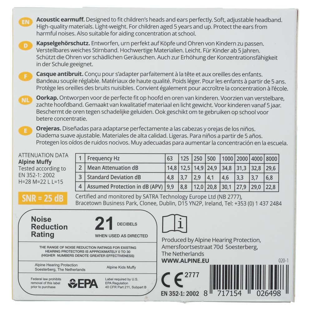 Alpine Muffy Kids is ontworpen om het extra gevoelige gehoor van kinderen van 5 tot 16 jaar te beschermen tegen schadelijk geluid. De oorkappen kunnen worden gebruikt in lawaaierige omgevingen, zoals feesten, optochten, vuurwerkshows, concerten, en auto- en motorraces. De kleine oorkappen voor kinderen zorgen ook voor geluidsreductie om de concentratie te verbeteren, bijvoorbeeld in lawaaierige klaslokalen. De hoofdband is verstelbaar en voorzien van een zachte voering. Alpine Muffy Kids oorkappen zijn verkrijgbaar in vijf nieuwe, trendy kleuren. De buitenlaag van de kleurrijke oorkappen is gemaakt van kunststof en daardoor gemakkelijk schoon te maken. De oorkappen kunnen worden opgevouwen, zodat ze gemakkelijk mee te nemen zijn. Geef uw kind een comfortabel en veilig gevoel.