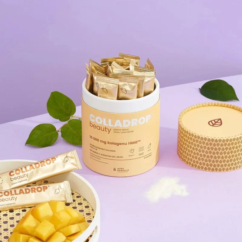 Colladrop ® Beauty, een HMG™ collageen van Aura Herbals, is een voedingssupplement in poedervorm met mangosmaak dat gehydrolyseerd marien collageen van het type I en III bevat, evenals co-enzym Q10, selenium en de vitamine Quali ® -C van het merk.