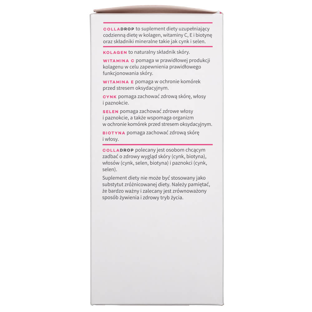 Water, NatiCol ® collageen uit de huid van zeevis, zoetstof: invertsuiker, L-ascorbinezuur (vitamine C), zinkgluconaat, conserveermiddel: kaliumsorbaat, D-alfa-tocoferol (vitamine E), natriumseleniet, D-biotine.