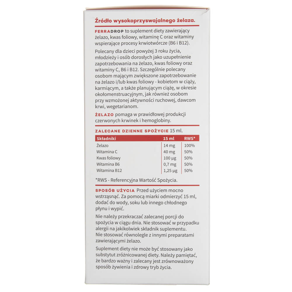Ferradrop is een voedingssupplement van Aura Herbals met ijzer + vitamine C + vitamine B6, B9 en B12. Speciale eigenschappen van ijzer ondersteunt de juiste aanmaak van rode bloedcellen en hemoglobine ondersteunt de juiste werking van het immuunsysteem helpt bij het behoud van de juiste cognitieve functies vermindert het gevoel van vermoeidheid en moeheid Speciale eigenschappen van foliumzuur (vitamine B9) folaten ondersteunen de juiste werking van het immuunsysteem folaten helpen bij de juiste bloedaanmaak folaten dragen bij aan de groei van het moederlijk weefsel tijdens de zwangerschap folaten nemen deel aan het proces van celdeling