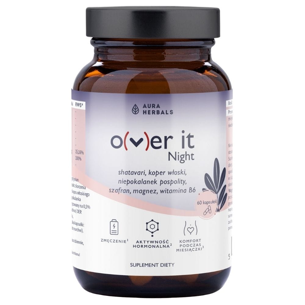 Aura Herbals Over It Night is een voedingssupplement in capsulevorm. Bron van plantenextracten uit kuisboom, saffraan, shatavari, en venkel. De samenstelling is verrijkt met magnesium en vitamine B6 (Quali ® -B).