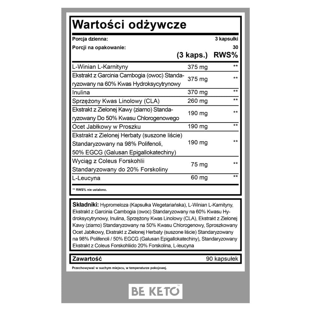 Hypromellose (Vegetarische capsule), L-Carnitine Tartraat, Garcinia Cambogia Extract (fruit) Gestandaardiseerd op 60% Hydroxycitroenzuur, Inuline, Geconjugeerd linolzuur, Groene koffie-extract (graan) Gestandaardiseerd op 50% chlorogeenzuur, Appelciderazijnpoeder, Groene thee-extract (gedroogde bladeren) Gestandaardiseerd op 98% polyfenolen,50% EGCG (Gallusan Epigallocatechine), Coleus Forskohilia-extract Gestandaardiseerd op 20% Forskolin, L-Leucine.
