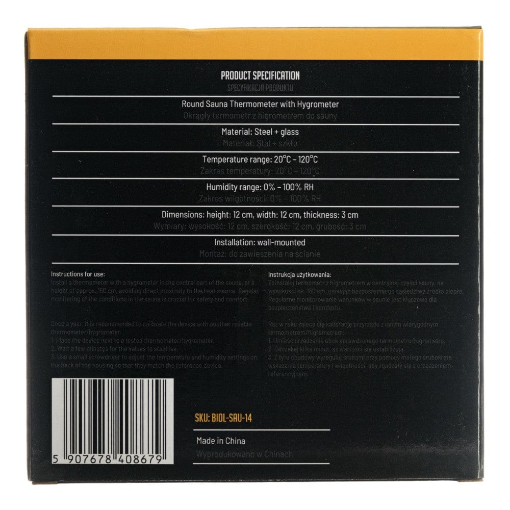 De Bilovit Ronde Sauna Thermometer met Hygrometer is een elegant instrument voor het nauwkeurig meten van de temperatuur (20-120 °C) en de luchtvochtigheid (0-100%) in de sauna. Gemaakt van duurzaam staal en glas, garandeert het een lange levensduur en een stijlvolle uitstraling. De compacte afmetingen (12 x 12 x 3 cm) en eenvoudige installatie op een hoogte van 150 cm maken het de perfecte aanvulling op elke sauna, waardoor comfortabel en veilig saunabezoek gegarandeerd is.
