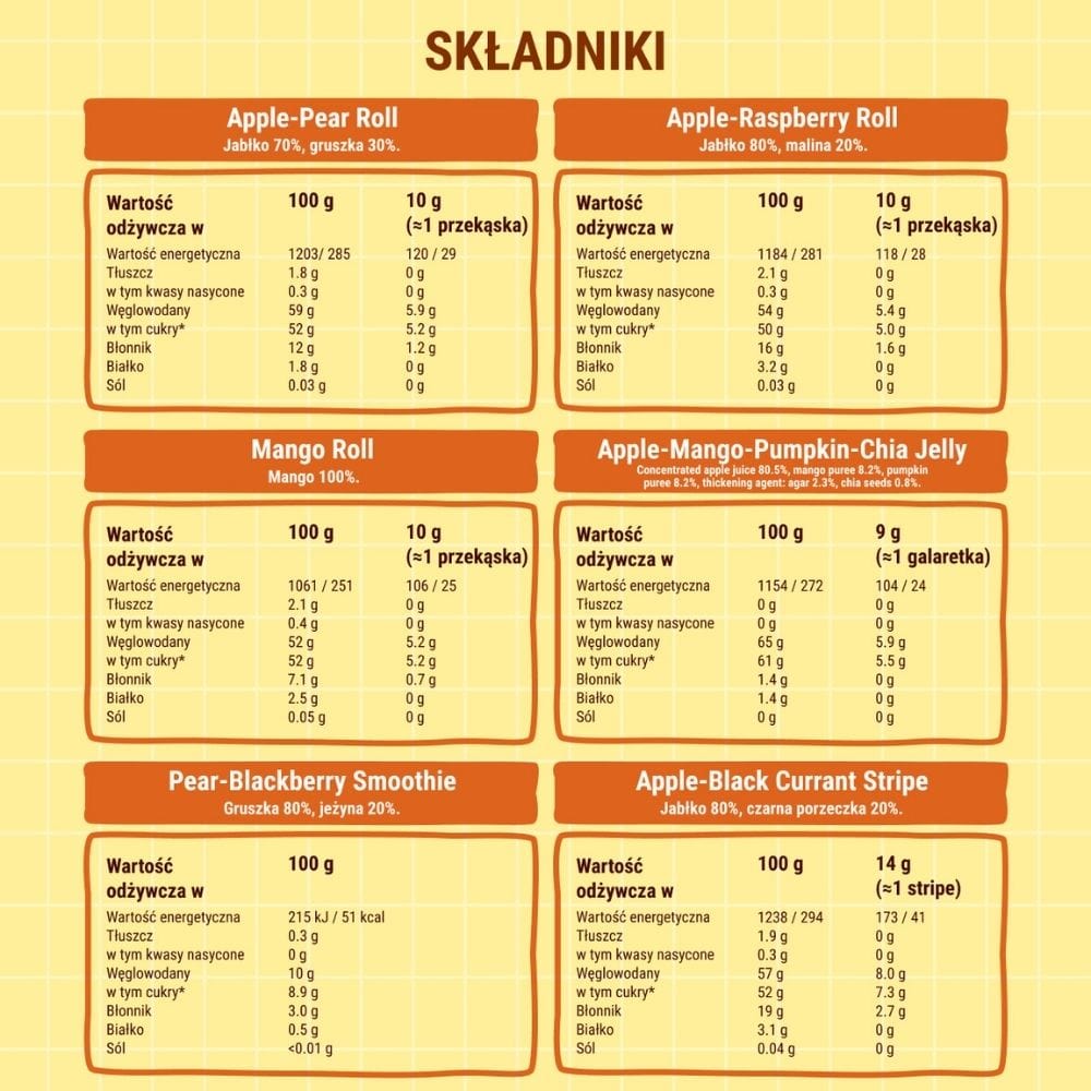 - Appel-frambozenrolletjes (ingrediënten: appel 80%, framboos 20%)