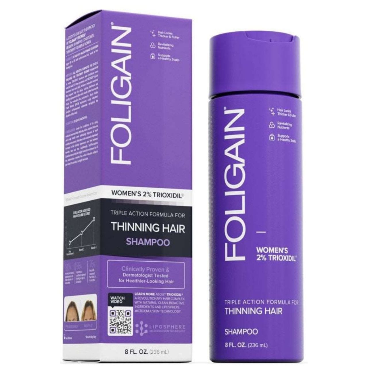 FOLIGAIN Triple Action Shampoo voor dunner wordend haar voor vrouwen met 2% Trioxidil is een revitaliserende shampoo die effectief de haardichtheid bevordert en haaruitval vermindert. De klinisch bewezen formule verhoogt het haarvolume met wel 180% in 4 maanden, terwijl de hoofdhuid voedt en de haarzakjes versterkt.