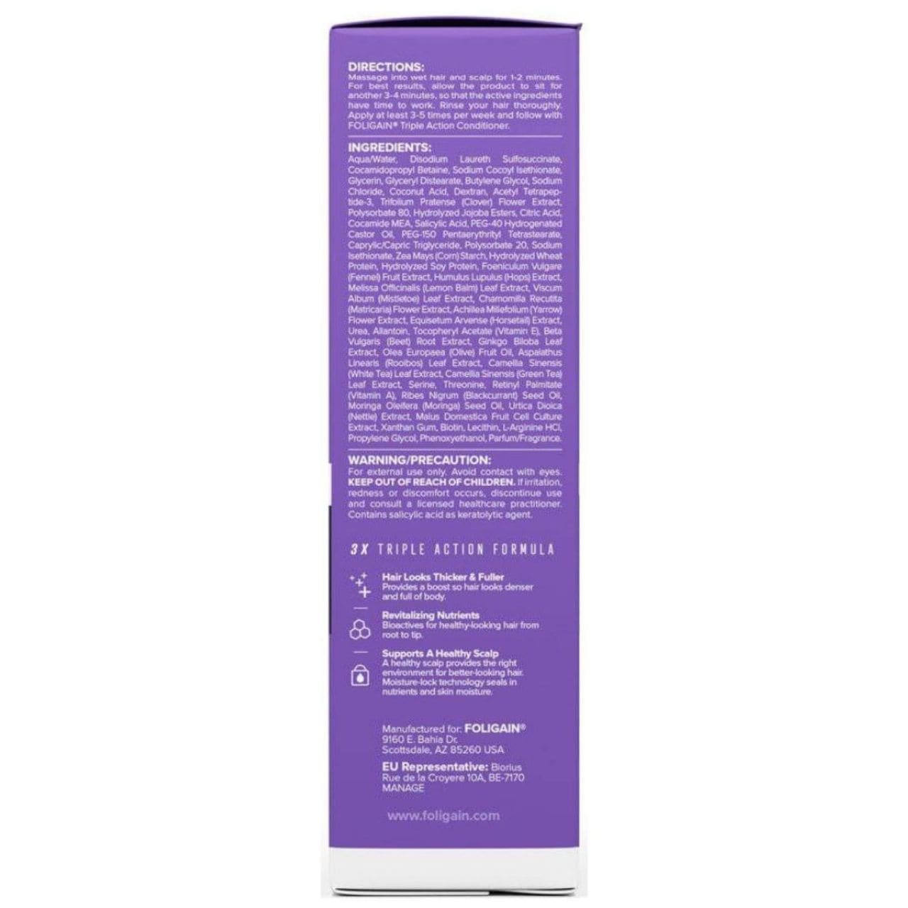 FOLIGAIN Triple Action Shampoo is een baanbrekende oplossing die speciaal is ontwikkeld voor vrouwen die kampen met dunner wordend haar. Dankzij het gehalte van 2% Trioxidyl – een innovatief complex dat sneller werkt dan Minoxidil – reinigt de shampoo niet alleen, maar ondersteunt hij ook actief de regeneratie van het haar.