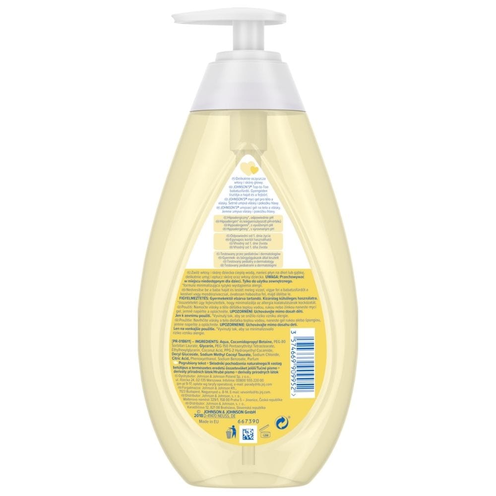 Johnson's Baby Top-To-Toe 500 ml is een zachte wasgel voor lichaam en haar geschikt vanaf de eerste dag. De hypoallergene formule met een gebalanceerde pH-waarde minimaliseert het risico op allergieën. Getest door kinderartsen en Derma tandartsen , zorgt het voor een veilige reiniging van de tere babyhuid.