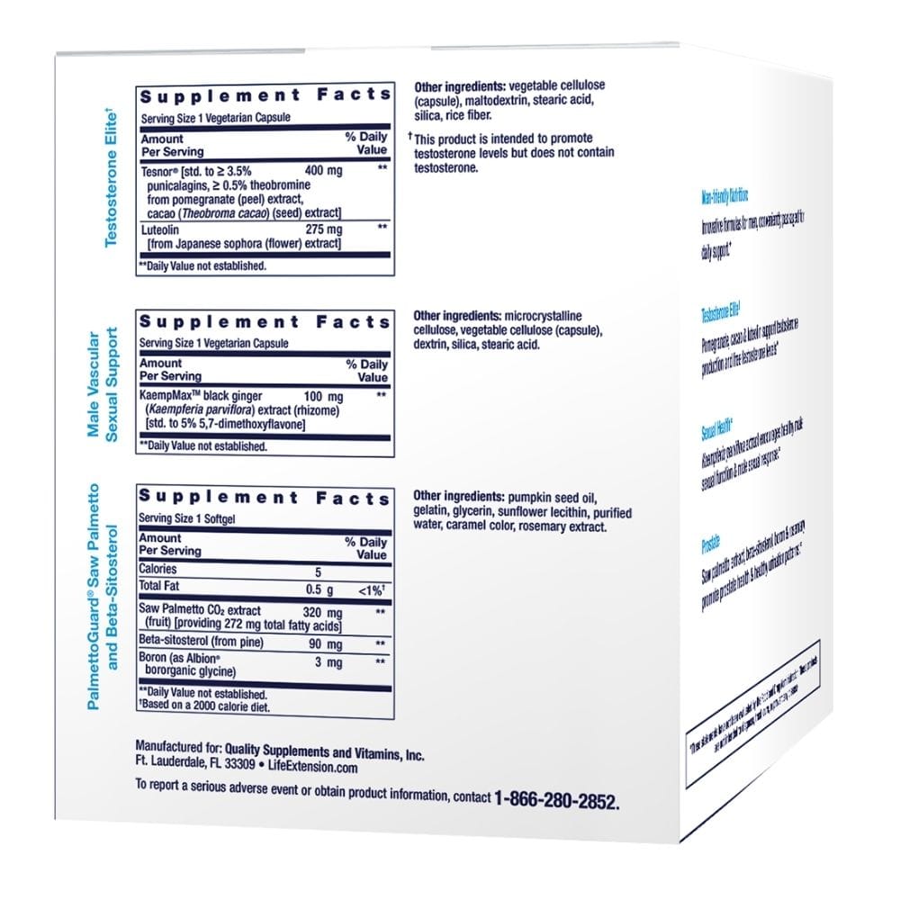 Dagelijkse gezondheidsondersteuning op maat voor mannen: Men's Vitality Packs combineren drie formules voor seksuele gezondheid van mannen, gezonde vrije en totale testosteronspiegels, en prostaat- en urinegezondheid. Life Extension Men's Vitality Pack is een voedingssupplement dat verkrijgbaar is in handige capsulezakjes.