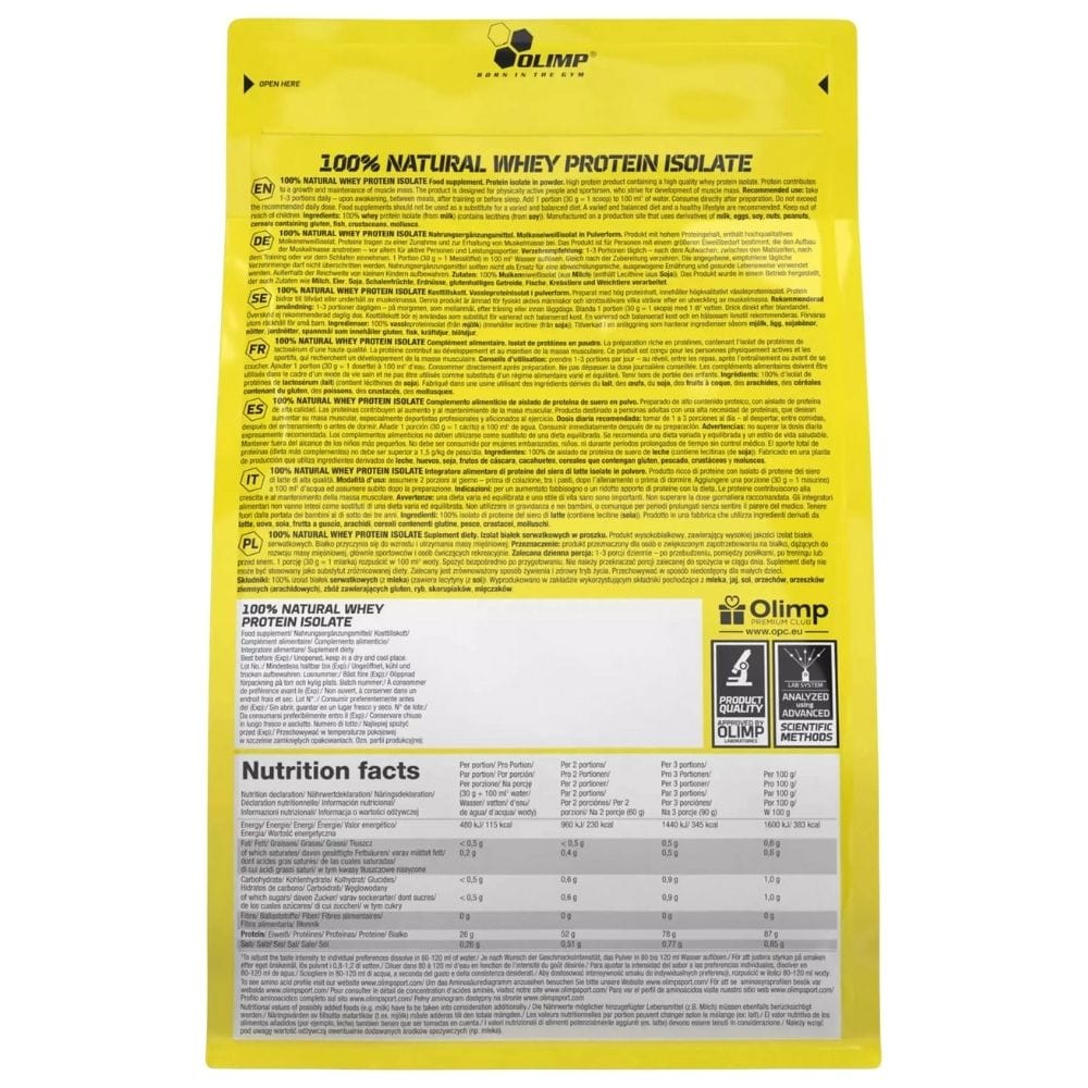Olimp 100% Natural Whey Protein Isolate is een voedingssupplement in poedervorm met een natuurlijke smaak. De formule bevat 100% wei-eiwit isolaat, zonder onnodige toevoegingen en vulstoffen.