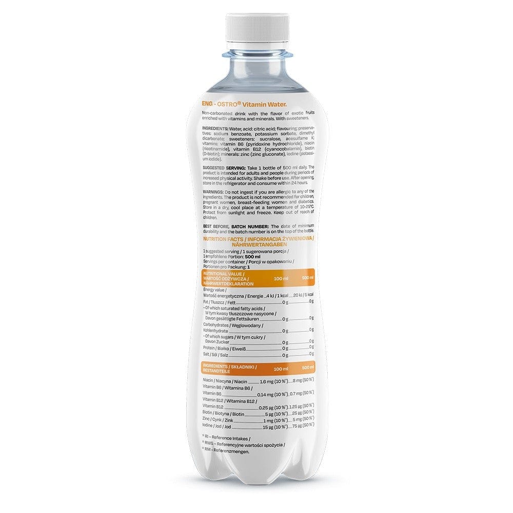 Ostrovit OSTRO ® Vitamin Water is een energiezuinige drank zonder koolzuur die het lichaam voorziet van waardevolle vitaminen en mineralen. Het is een product met exotische fruitsmaak zonder toegevoegde suikers, gemaakt voor sporters en mensen met een verhoogde behoefte aan waardevolle micronutriënten.