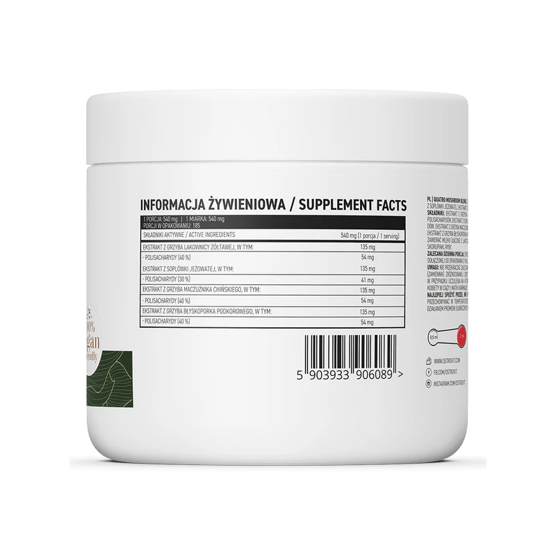 Ostrovit Quatro Mushroom Blend Vege is een unieke combinatie van extracten van vier verschillende paddenstoelen - yellow lacewing, coneflower, Chinese foelie en subclavian spinneret. Het is een preparaat dat beschikbaar is in een handige poedervorm, gemaakt voor mensen die hun dieet willen aanvullen met natuurlijke, waardevolle ingrediënten. Het preparaat is veganistisch, zonder onnodige toevoegingen.