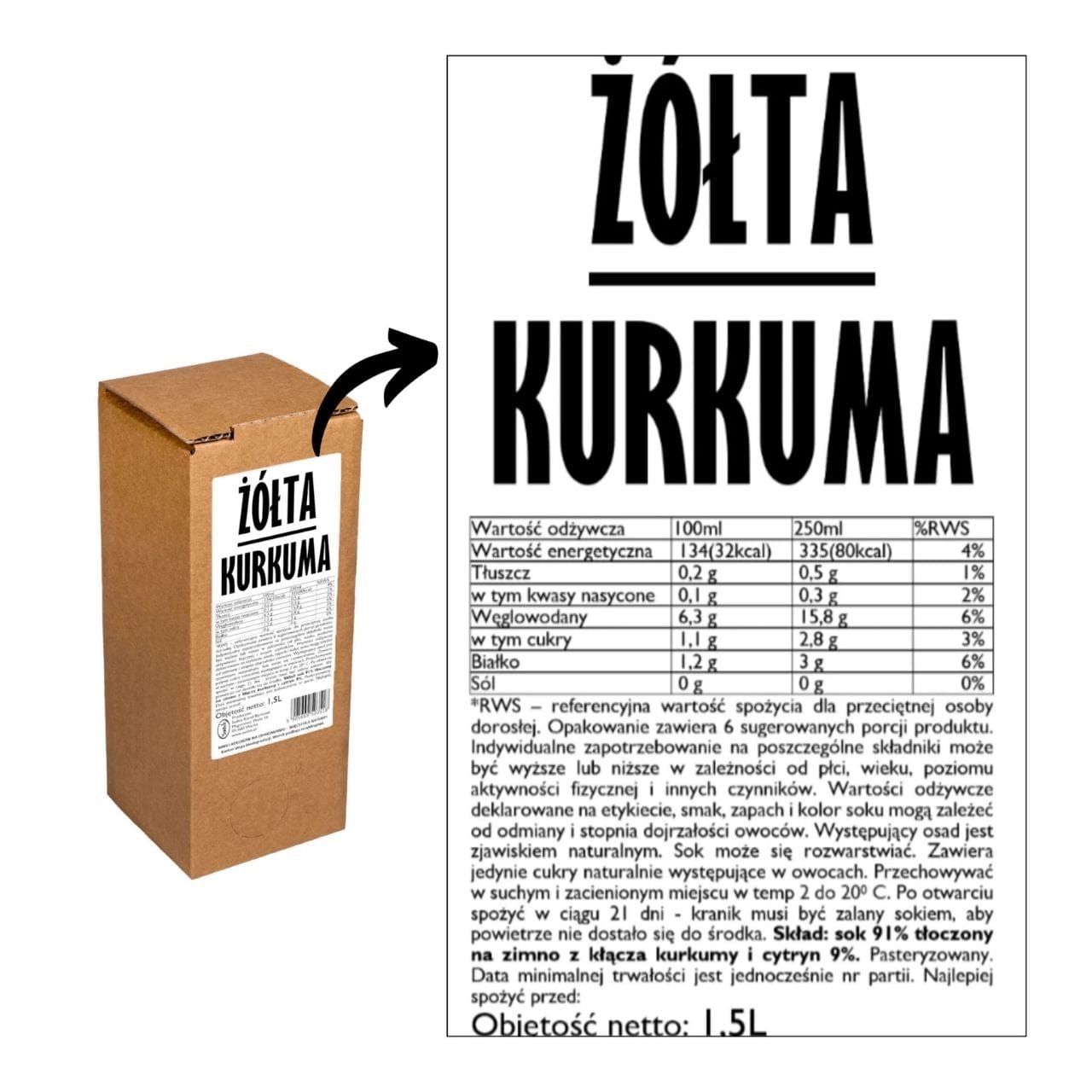 Sadvit Turmeric Juice is 100% natural cold-pressed juice from turmeric rhizomes (Curcuma longa) with added lemon juice, produced without concentrates, preservatives, flavourings or added sugar. Ingredients: turmeric 91%, lemon juice 9%. Pasteurised at 73°C. One 1500 ml package contains 6 servings (50 ml each). Naturally cloudy product, NFC. Does not contain: preservatives, flavourings, gluten, GMOs, sweeteners, added sugar.