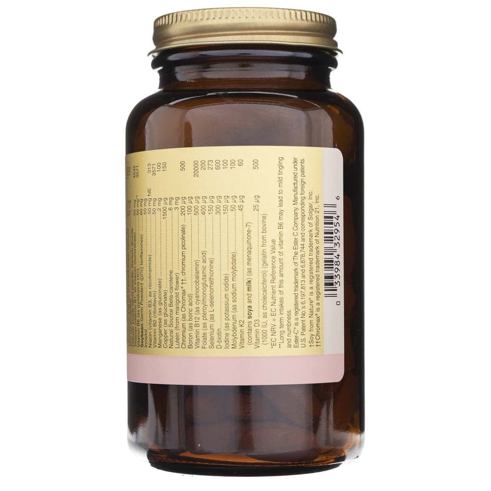 Calcium (citraat, ascorbaat), vulstoffen: Microkristallijne cellulose, dicalciumfosfaat, alginaat, erwtenzetmeel, dextrine, hydroxypropylcellulose, gemodificeerd voedingszetmeel, magnesium (als citraat, oxide), Vitamine C (als ester-...C, calciumascorbaat), Vitamine E (als D-alfa tocoferylzuursuccinaat), citrusbioflavonoidencomplex, antiklontermiddelen: plantaardig stearinezuur, siliciumdioxide, plantaardig magnesiumstearaat, cellulosegom, choline (als diquinaat), glansmiddelen: hydroxypropylmethylcellulose, plantaardige glycerine (uit palmpitolie en kokosolie), Pantotheenzuur (als D-pantothenaat, calcium), zink (als picolinaat), Kleurstoffen: Paars wortelpoeder, Titaandioxide, Thiamine (vitamine B1 als thiaminemononitraat), Vitamine B6 (als pyridoxine HCl), Sojakiempoeder ([2%] isoflavonen), Inositol, niacine (vitamine B3, als nicotinamide), vitamine B2 (riboflavine), mangaan (als gluconaat), koper (als gluconaat), natuurlijke bron van beta-caroteen, Luteine (uit goudsbloem), Chroom (als C hromax, chroompicolinaat), boor (als boorzuur), vitamine B12 (als cyanocobalamine), folaat (als pteroylmonoglutaminezuur), selenium (als L-selenomethionine), D-biotine, jodium (als kaliumjodide), molybdeen (als natriummolybdaat), vitamine K2 (bevat soja en melk) (als menachinon-7), vitamine D3 (als cholecalciferol) (rundergelatine).
