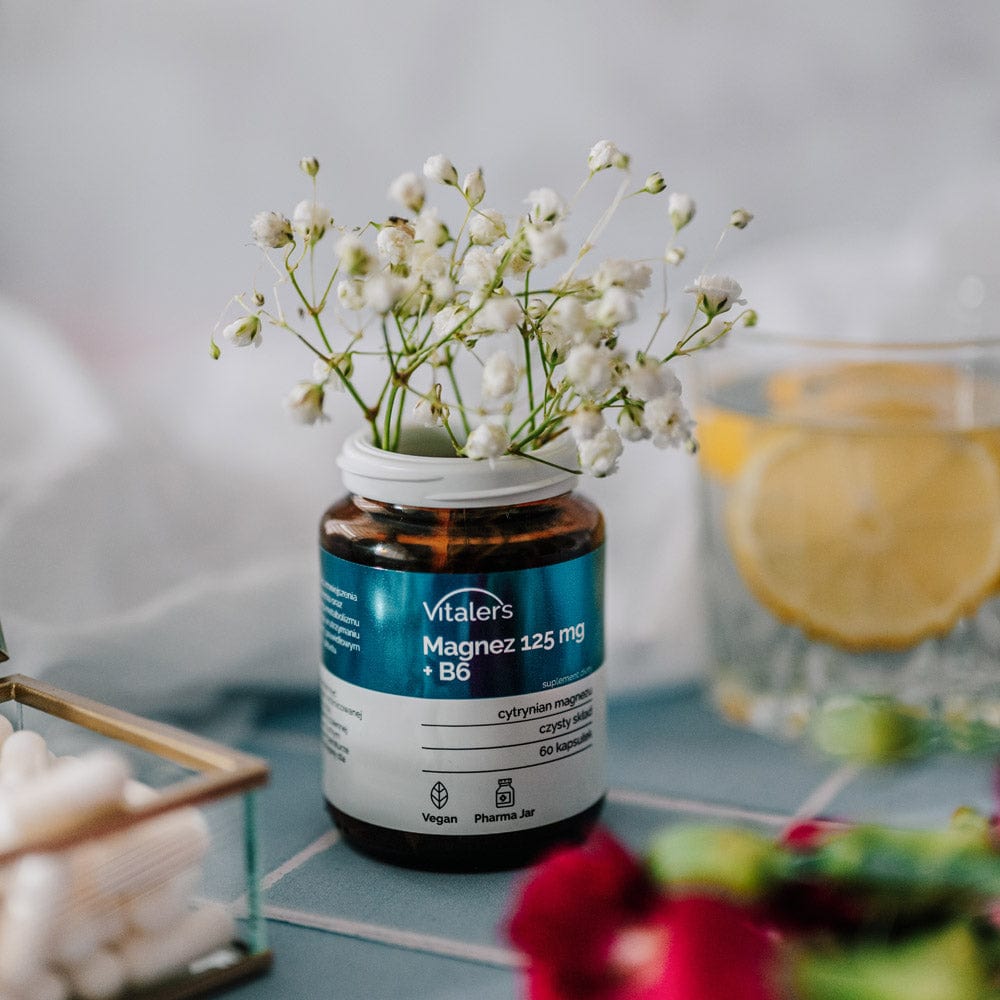Vitaler's Magnesium 125 mg + B6 is een voedingssupplement dat voldoet aan de richtlijnen voor een veganistisch en vegetarisch dieet. Dankzij de vitamine B6 in het product, wordt de opname van magnesium uit het maag-darmkanaal met 20-40% verhoogd.