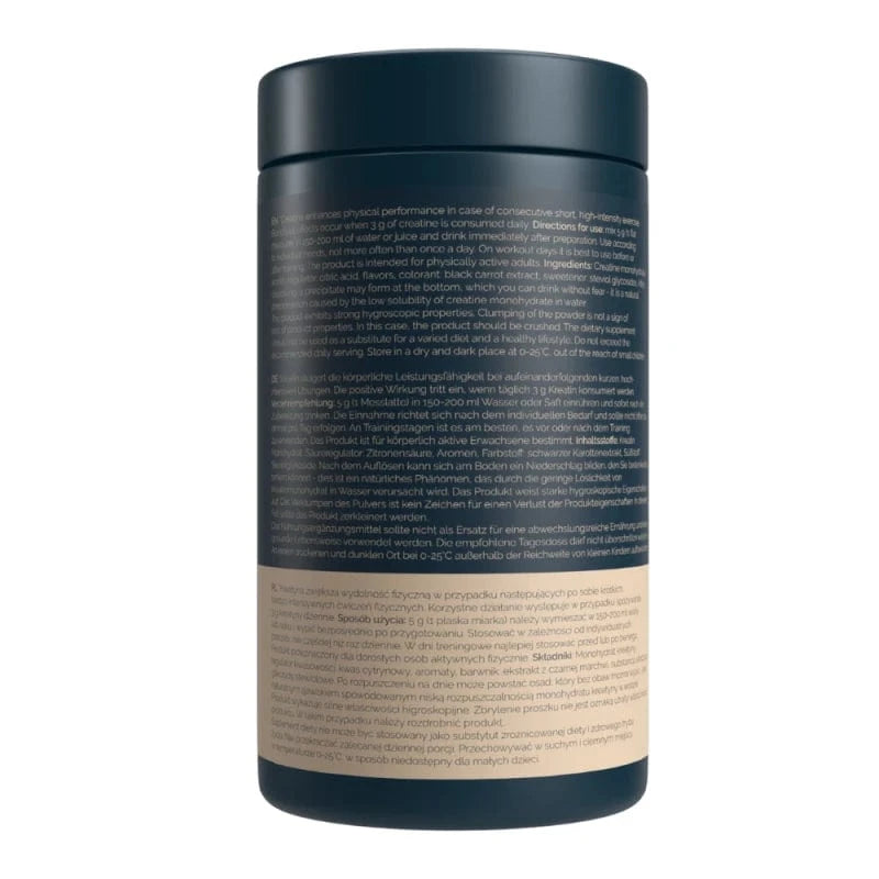 - Gemicroniseerde creatine monohydraat (200 mesh) - betere oplosbaarheid en biologische beschikbaarheid.