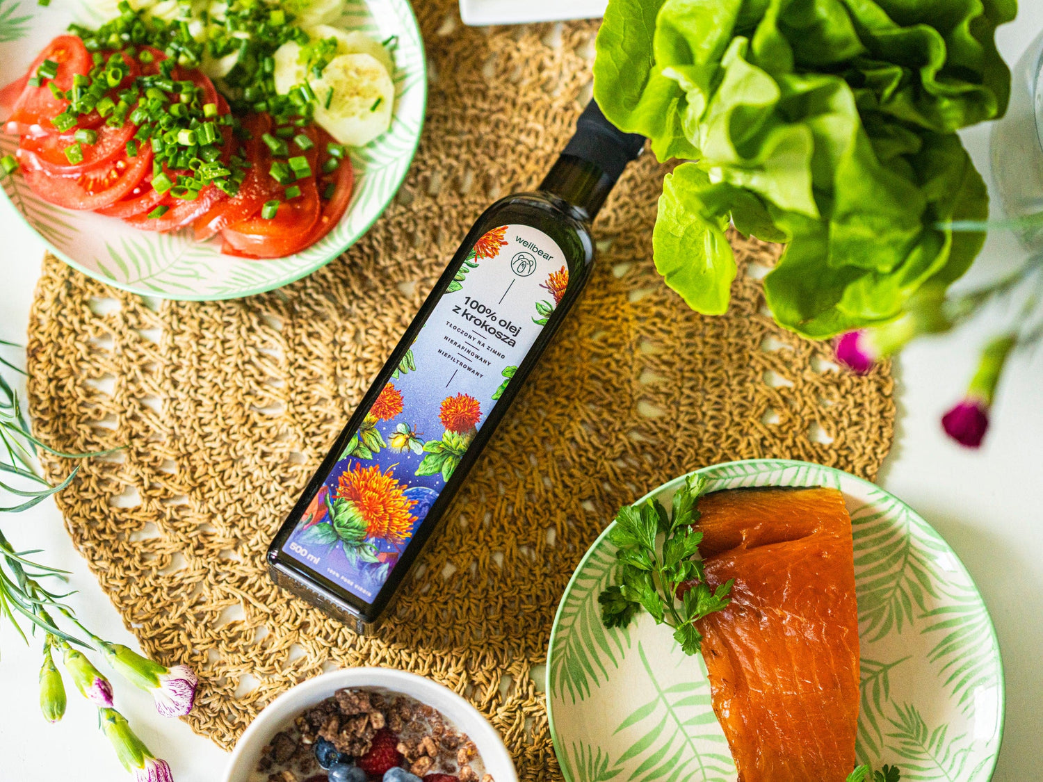 Saffloerolie wordt veel gebruikt in de keuken, waardoor het gemakkelijk in je dagelijkse voeding is op te nemen. Het product heeft een lichte textuur en een aangename, licht bittere smaak. Het is perfect voor het bereiden van salades, salades, dips en sauzen. Het wordt vooral aanbevolen als basis voor zelfgemaakte mayonaise. Het is echter goed om te onthouden dat saffloerolie niet geschikt is om in te bakken.