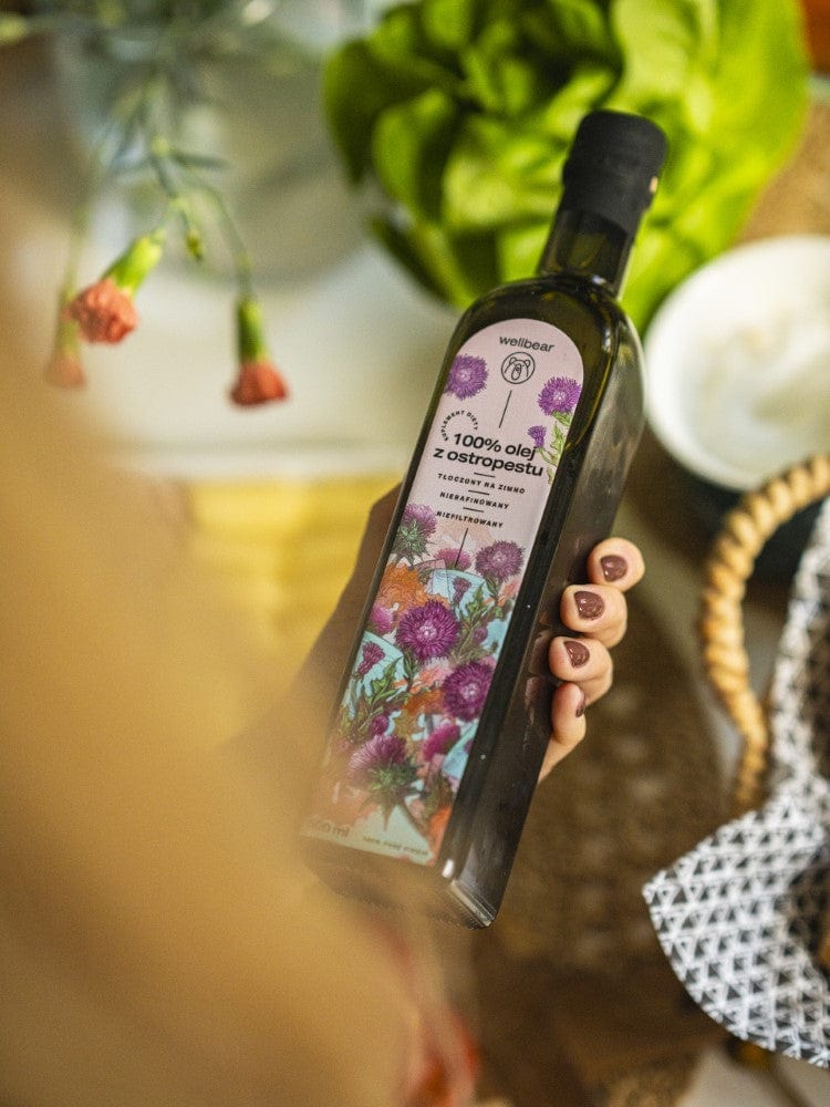 Mariadistelolie van Wellbear helpt u uw gezondheid in topconditie te houden. De olie is natuurlijk, ongefilterd en ongeraffineerd, koudgeperst in een Poolse oliemolen. Het bevat geen conserveermiddelen of additieven, zodat het zijn gezondheidsbevorderende eigenschappen tot een maand na opening van de fles behoudt wanneer u het in de koelkast bewaart.
